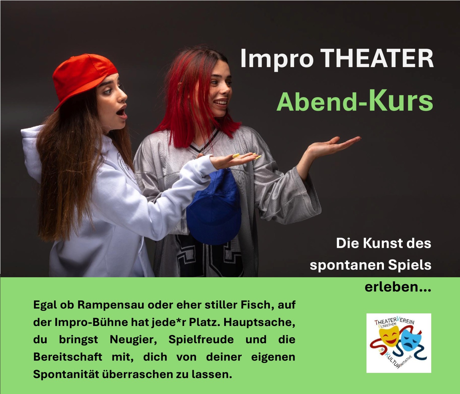 Egal ob Rampensau oder eher stiller Fisch: auf der Impro-Bühne hat jede*r Platz. Hauptsache, du bringst Neugier, Spielfreude und die Bereitschaft mit, dich von deiner eigenen Spontaneität überraschen zu lassen.